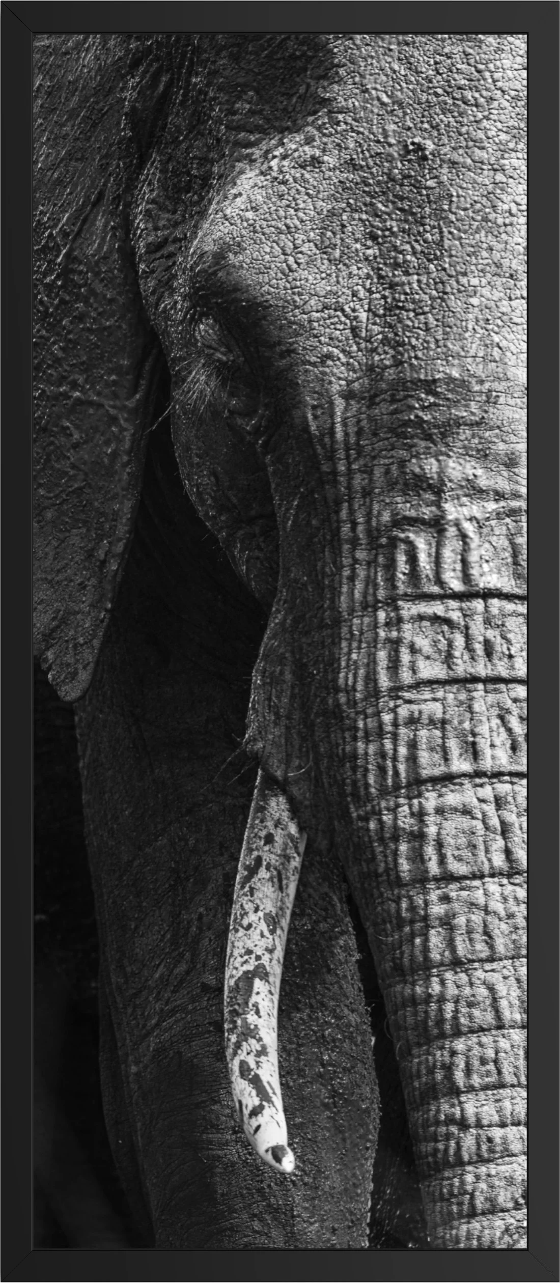 focusing on fragments of the elephant’s presence — the face, the tusks, the skin.’’